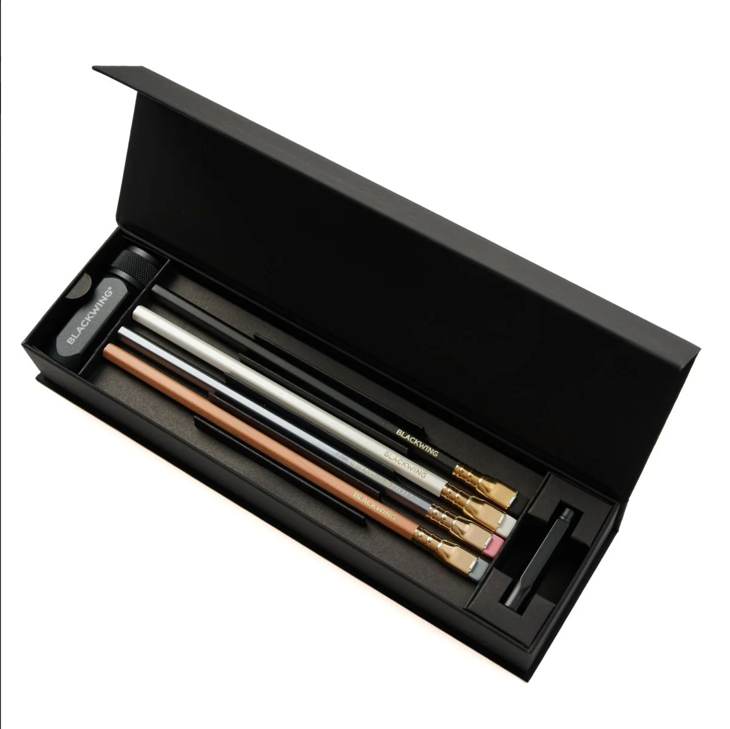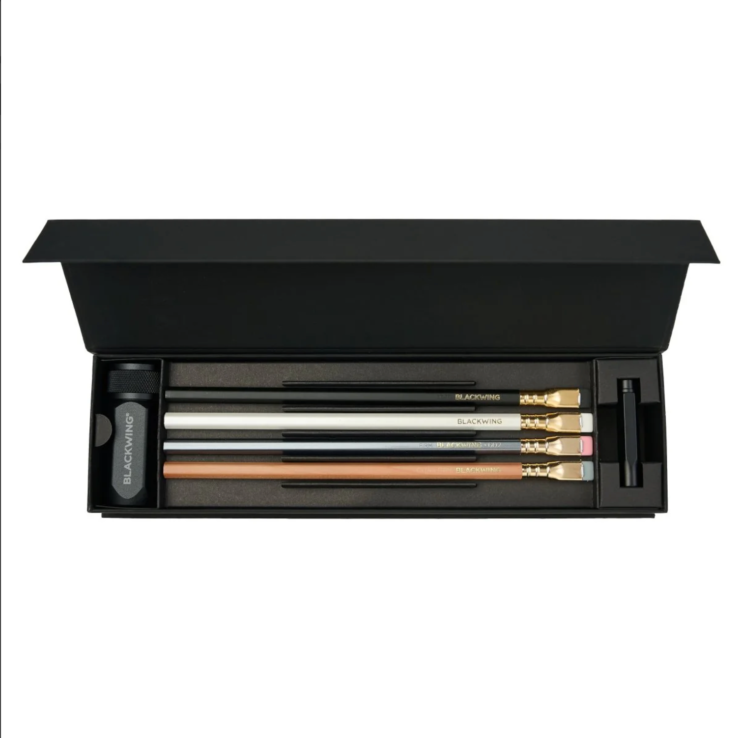 Grunnsettið inniheldur fjóra blýanta sem eru mismunandi að mýkt ásamt loki á blýantana til að koma í veg fyrir að þú brjótir oddinn af þegar þú ert að ferðast með þá. Að lokum inniheldur settið Blackwing yddara sem skilar frábærum blýantsoddi.