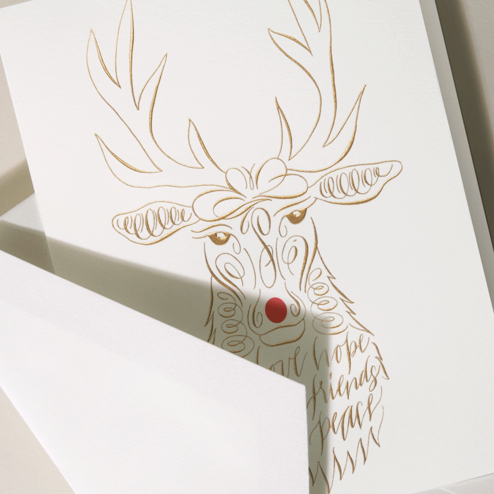 Askjan inniheldur 10 kort og 10 umslög. 100% bómullarpappír með áþrykktu gylltu hreindýri.