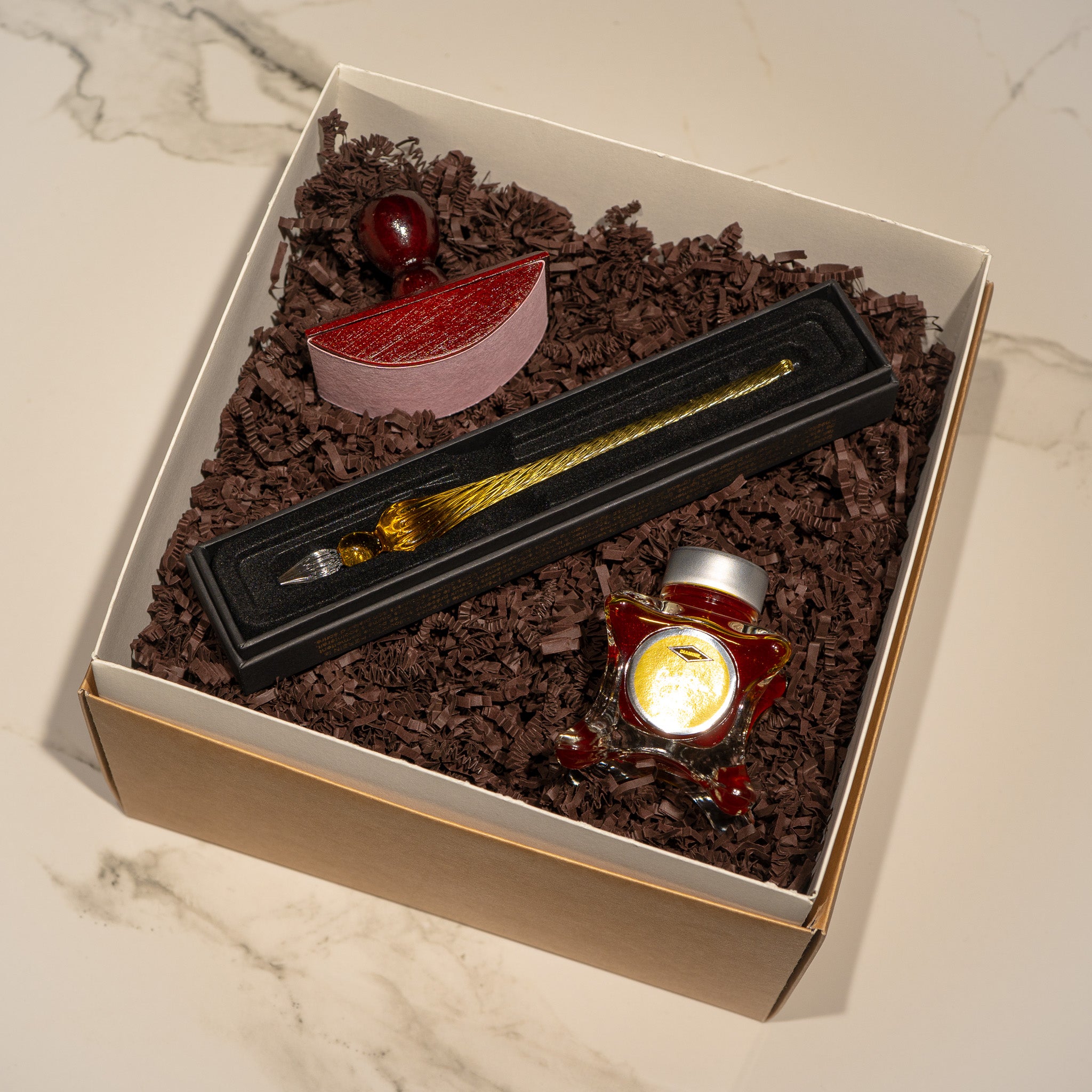 Gjafapakkinn inniheldur Glerpenna, blek og blekþerra og pappír frá Herbin