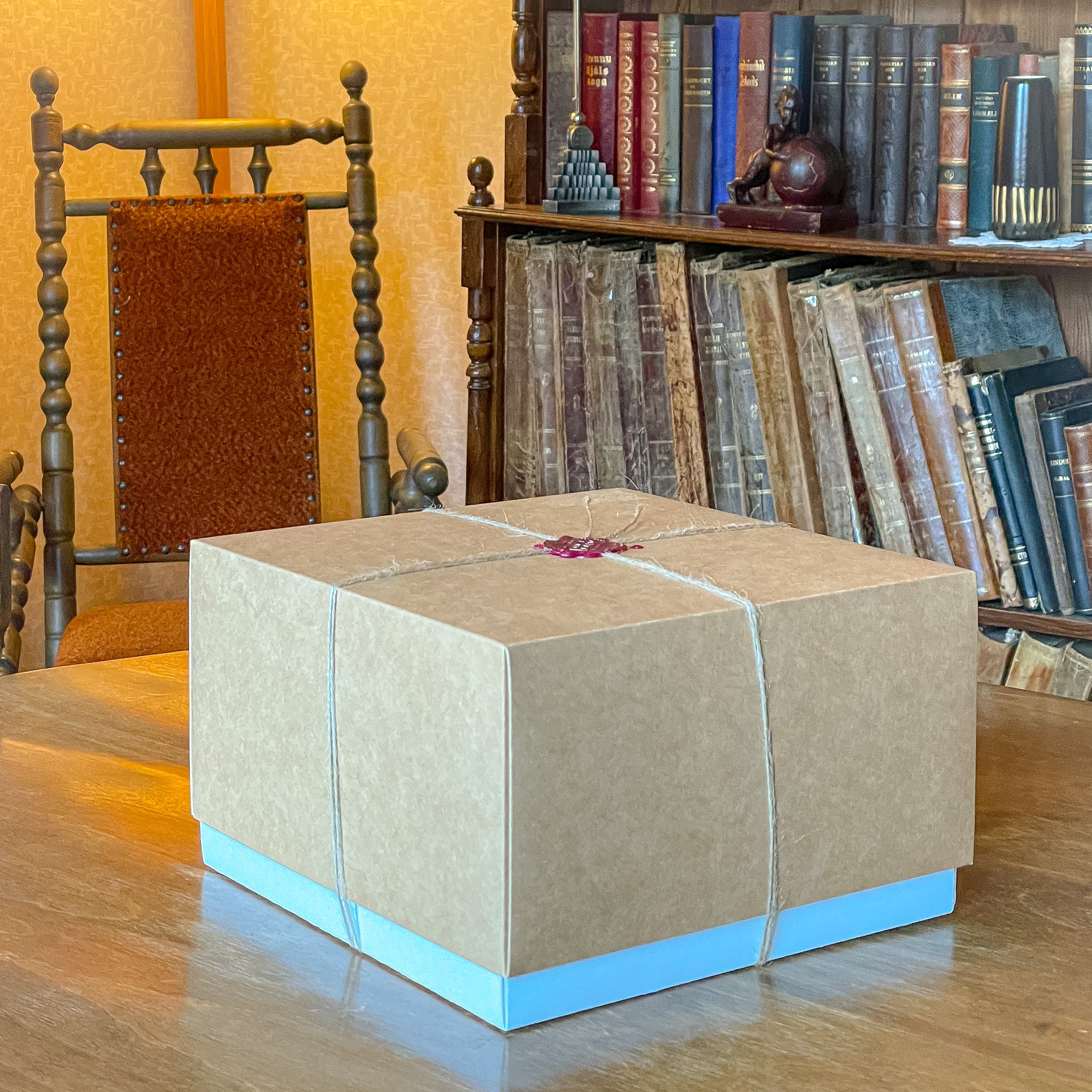 Gjafapakkinn inniheldur vörurnar ásamt pappírskrullum. Vörunum er pakkað inn í silkipappír og pakkinn svo hnýttur með snærisspotta sem er innsiglaður með fallegu vaxi sem er merkt Gömlu Bókabúðinni á Flateyri.