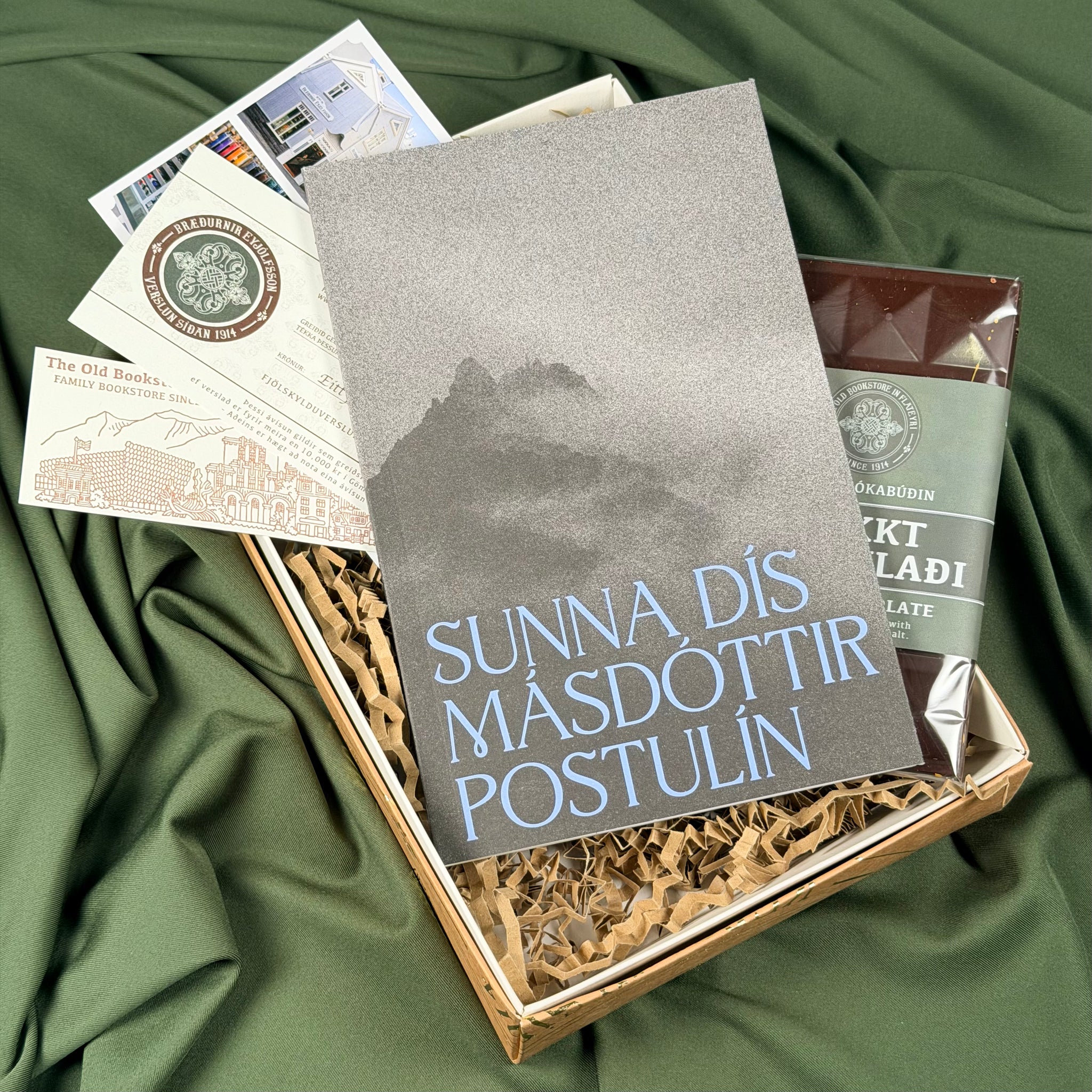 Einstakur gjafapakki sem inniheldur góða bók, árituð af höfundi, dásamlegt handgert súkkulaði frá Gömlu Bókabúðinni og handgert leturpressað bókamerki. Í pakkann höfum við einnig laumað afsláttarávísun sem hægt er að nota í verslunum okkar.