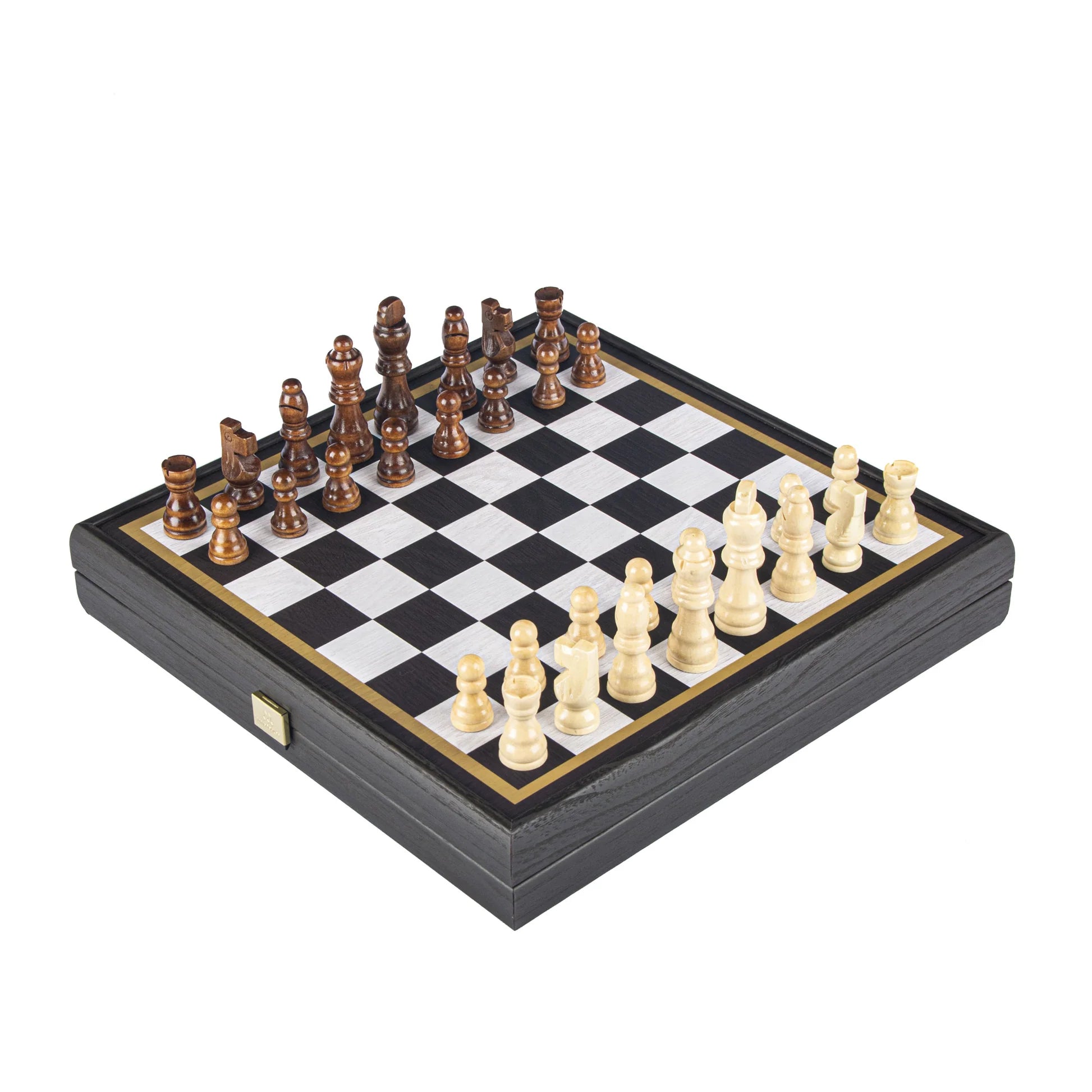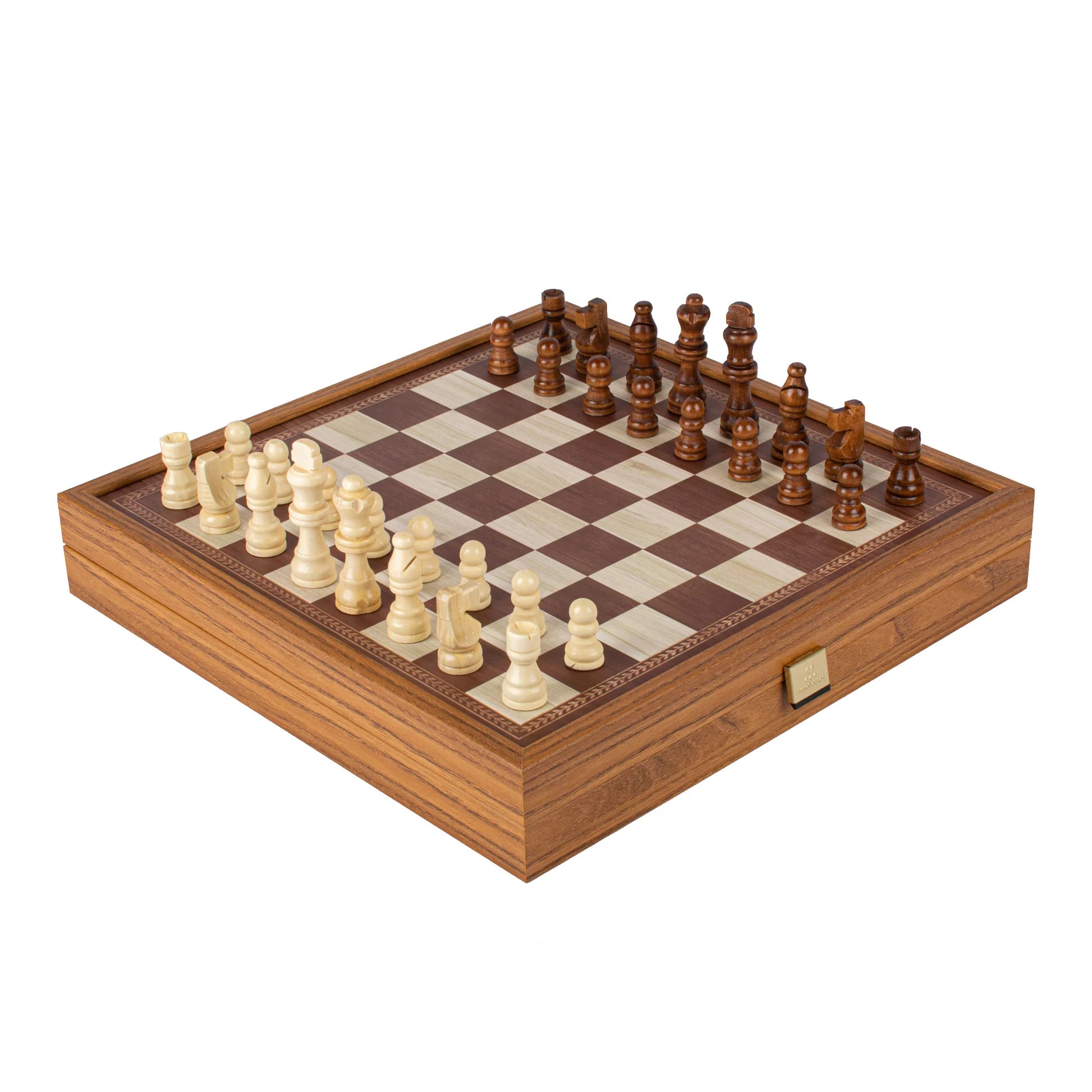 Fallegt handsmíðað 4 fyrir 1 spilasett frá Manopoulos í Grikklandi úr valhnotu og Vengé við, sem gefur einstakt og fágað útlit.